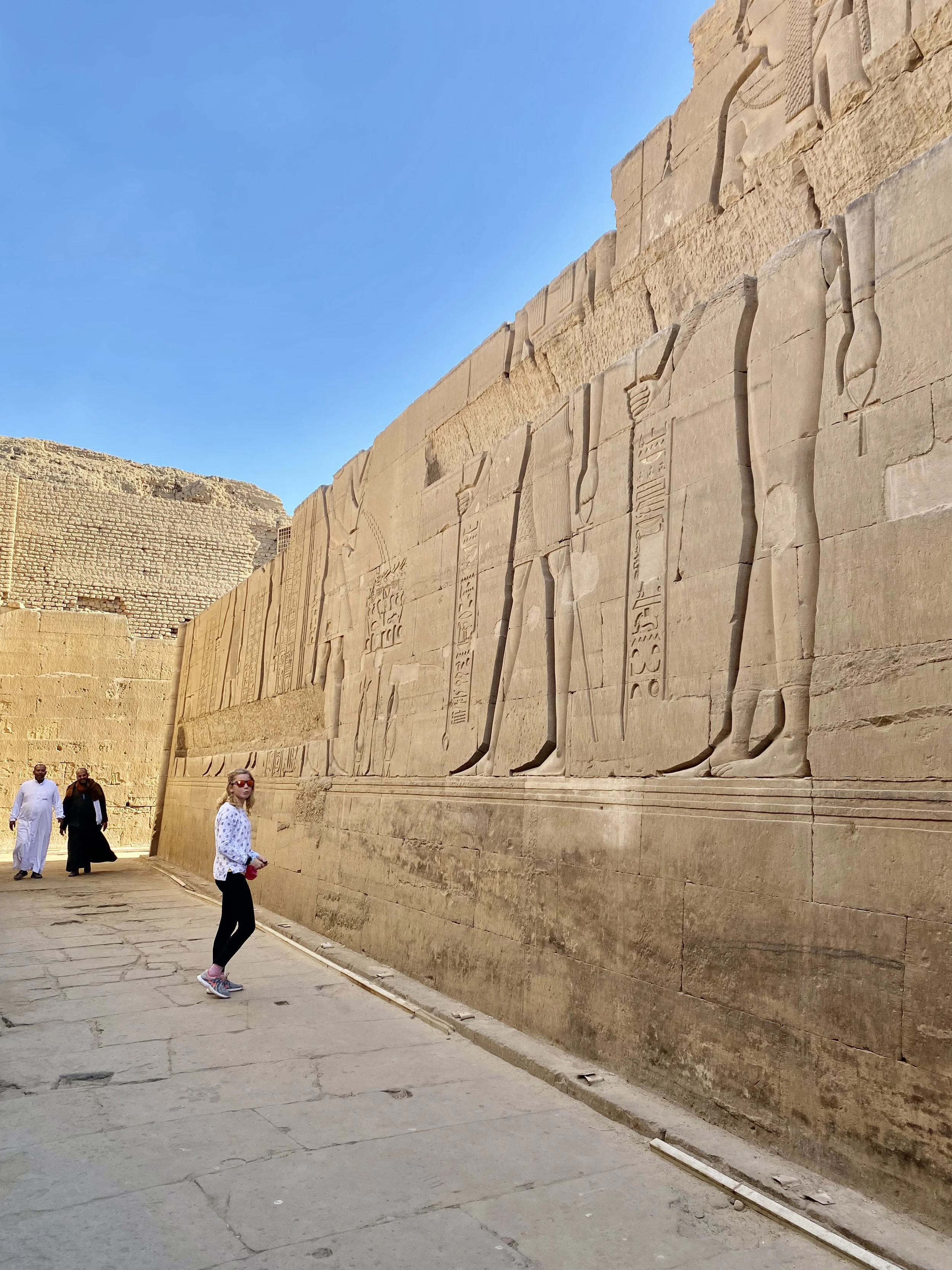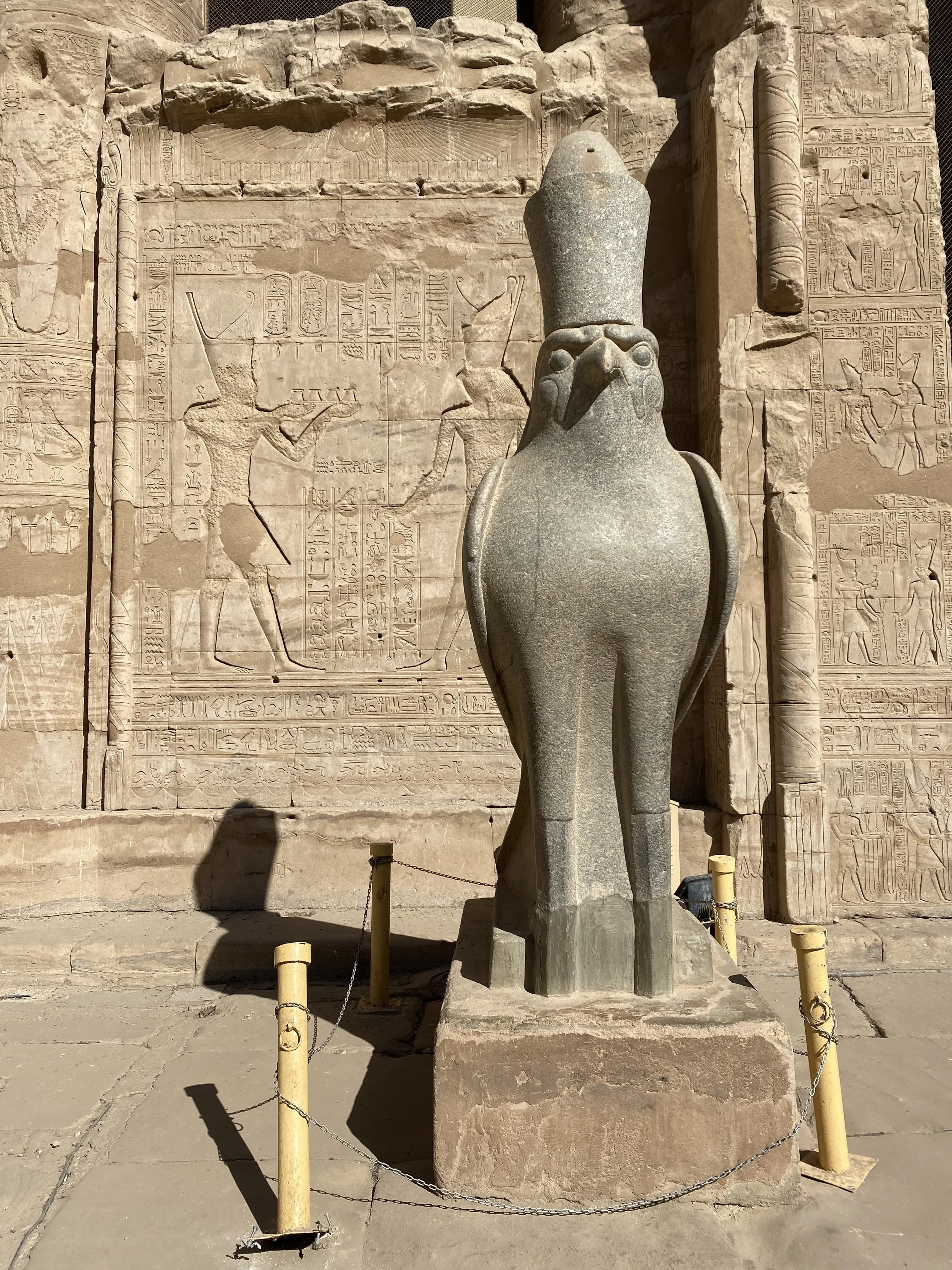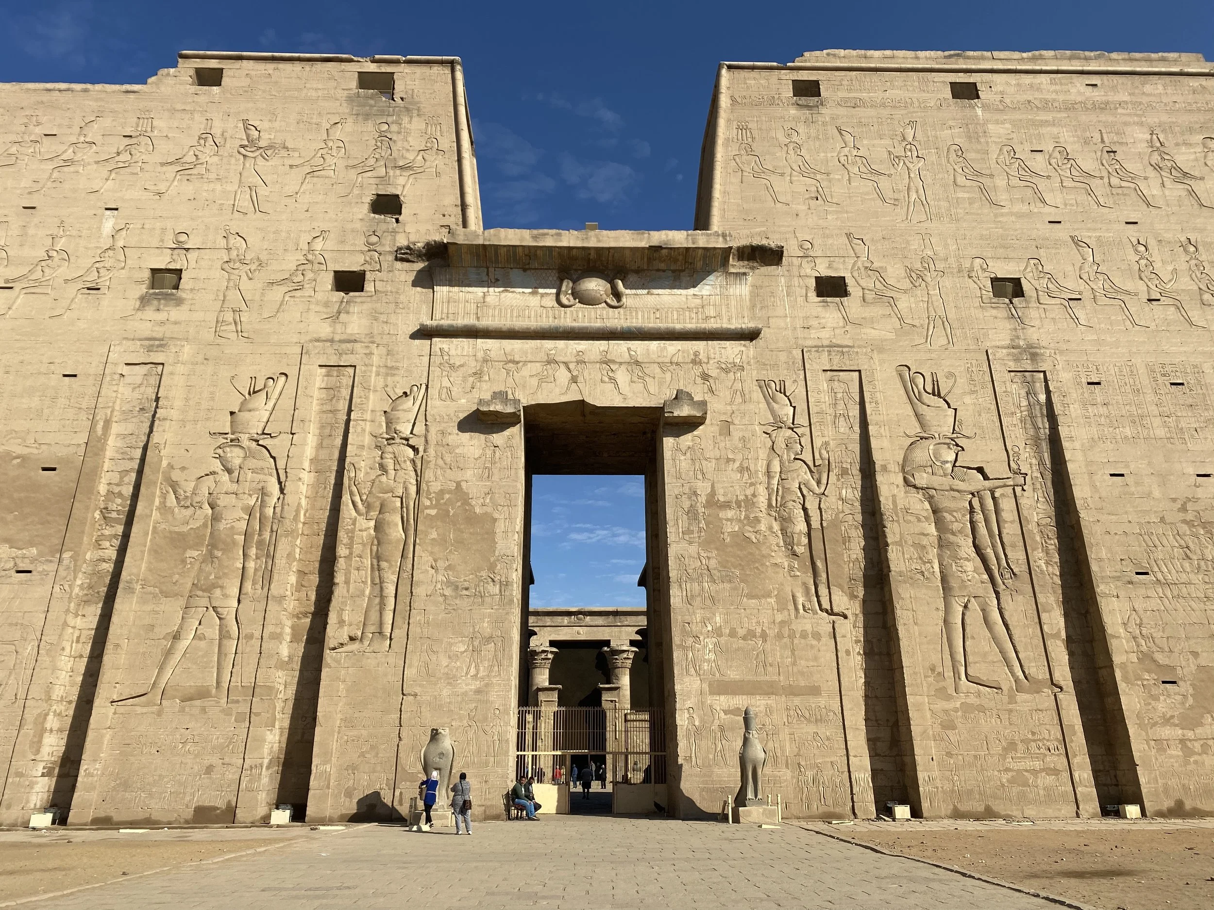 Temple of Horus (the son) at Edfu. The Temple of Horus is the second largest temple in Egypt, behind the temple of Karnak at Luxor. It worships Horus, a falcon god who is considered the βsonβ, while the one at Kom Ombo is the βelderβ. It is 26 m tall, 137 m long, and 79 m wide. The temple dated to the 3rd century BC and is amazingly well preserved. This is one of our favorite temples of all, as it was so stunningly put together and carved. It really is quite incredible and massive. Everything is covered in carving, the largest blank spots are less than a meter. Another important part of the temple is the nilometer, a well used by the ancient Egyptians to measure the height of the Nile, and therefore tax the pheasants, depending on how high the Nile River was they could assume how well the harvest was going to be. The Nilometer is connected to the Nile through tunnels underneath the ground.